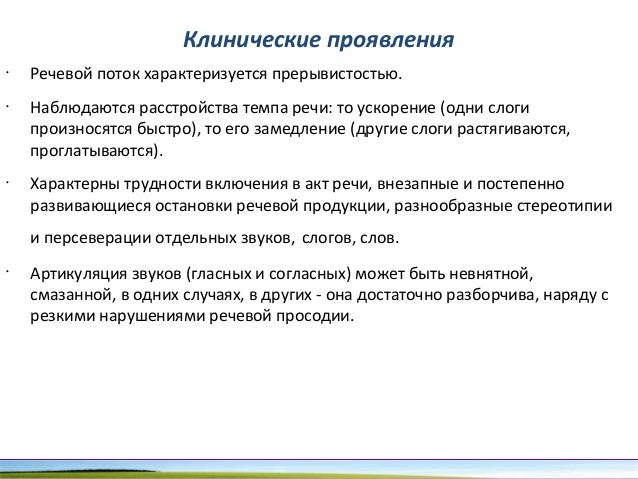 - 78. Клинические проявления • Речевой поток характеризуется прерывистостью. • Наблюдаются расстройства темпа речи: то ускорение (одни слоги произносятся быстро), то его замедление (другие слоги растягиваются, проглатываются). • Характерны трудности включения в акт речи, внезапные и постепенно развивающиеся остановки речевой продукции, разнообразные стереотипии и персеверации отдельных звуков, слогов, слов. • Артикуляция звуков (гласных и согласных) может быть невнятной, смазанной, в одних случаях, в других она достаточно разборчива, наряду с резкими нарушениями речевой просодии.