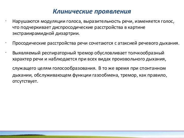 - 79. Клинические проявления • Нарушаются модуляции голоса, выразительность речи, изменяется голос, что подчеркивает диспросодические расстройства в картине экстраиирамидной дизартрии. • Просодические расстройства речи сочетаются с атаксией речевого дыхания. • Выявляемый респираторный тремор обусловливает толчкообразный характер речи и наблюдается при всех видах произвольного дыхания, служащего целям голосообразования. В то же время при спонтанном дыхании, обслуживающем функции газообмена, тремор, как правило, отсутствует.