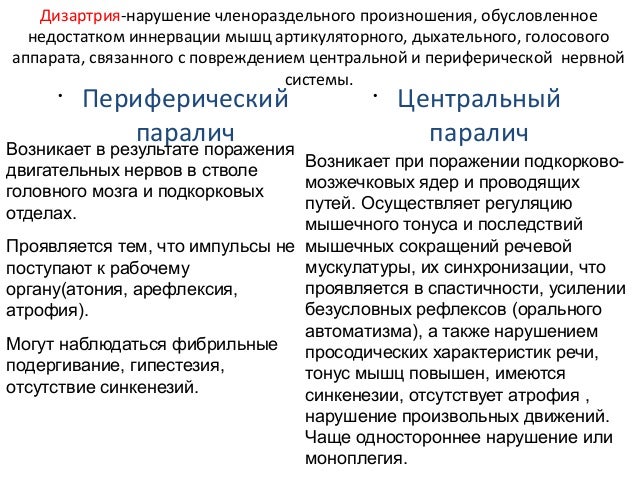 - 8. Дизартрия-нарушение членораздельного произношения, обусловленное недостатком иннервации мышц артикуляторного, дыхательного, голосового аппарата, связанного с повреждением центральной и периферической нервной системы. • Периферический параличВозникает в результате поражения двигательных нервов в стволе головного мозга и подкорковых отделах. Проявляется тем, что импульсы не поступают к рабочему органу(атония, арефлексия, атрофия). Могут наблюдаться фибрильные подергивание, гипестезия, отсутствие синкенезий. • Центральный паралич Возникает при поражении подкорково- мозжечковых ядер и проводящих путей. Осуществляет регуляцию мышечного тонуса и последствий мышечных сокращений речевой мускулатуры, их синхронизации, что проявляется в спастичности, усилении безусловных рефлексов (орального автоматизма), а также нарушением просодических характеристик речи, тонус мышц повышен, имеются синкенезии, отсутствует атрофия , нарушение произвольных движений. Чаще одностороннее нарушение или моноплегия.