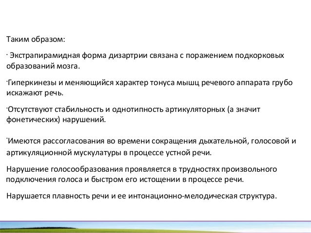 - 81. Таким образом: • Экстрапирамидная форма дизартрии связана с поражением подкорковых образований мозга. • Гиперкинезы и меняющийся характер тонуса мышц речевого аппарата грубо искажают речь. • Отсутствуют стабильность и однотипность артикуляторных (а значит фонетических) нарушений. • Имеются рассогласования во времени сокращения дыхательной, голосовой и артикуляционной мускулатуры в процессе устной речи. Нарушение голосообразования проявляется в трудностях произвольного подключения голоса и быстром его истощении в процессе речи. Нарушается плавность речи и ее интонационномелодическая структура.