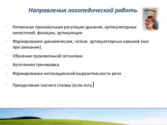 - 82. Направления логопедической работы • Ритмичная произвольная регуляция дыхания, артикуляторных кинестезий, фонации, артикуляции • Формирование динамических, четких артикуляторных навыков (как при заикании). • Обучение произвольной остановки • Аутогенная тренировка. • Формирование интонационной выразительности речи • Преодоление писчего спазма (если есть)