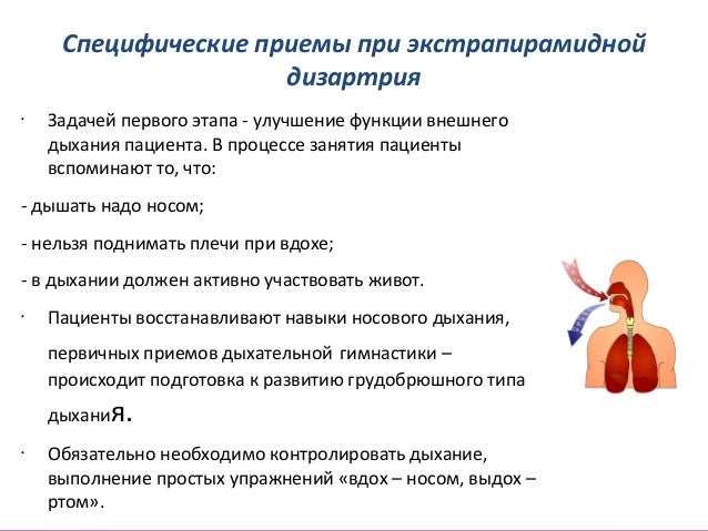 - 83. Специфические приемы при экстрапирамидной дизартрия • Задачей первого этапа улучшение функции внешнего дыхания пациента. В процессе занятия пациенты вспоминают то, что: дышать надо носом; нельзя поднимать плечи при вдохе; в дыхании должен активно участвовать живот. • Пациенты восстанавливают навыки носового дыхания, первичных приемов дыхательной гимнастики – происходит подготовка к развитию грудобрюшного типа дыхания. • Обязательно необходимо контролировать дыхание, выполнение простых упражнений «вдох – носом, выдох – ртом».