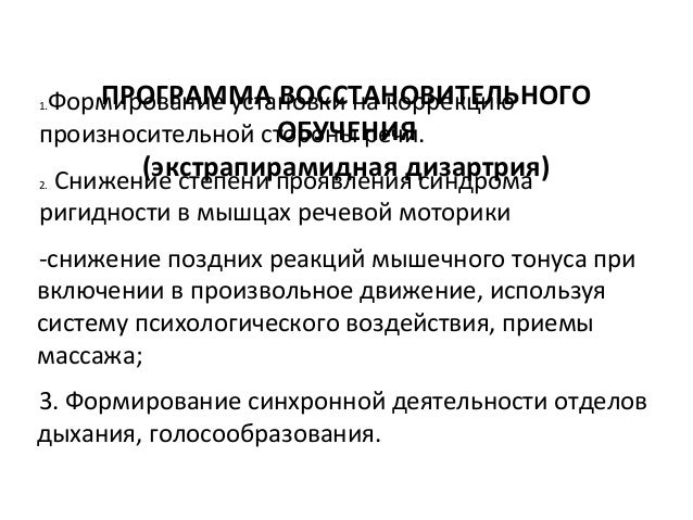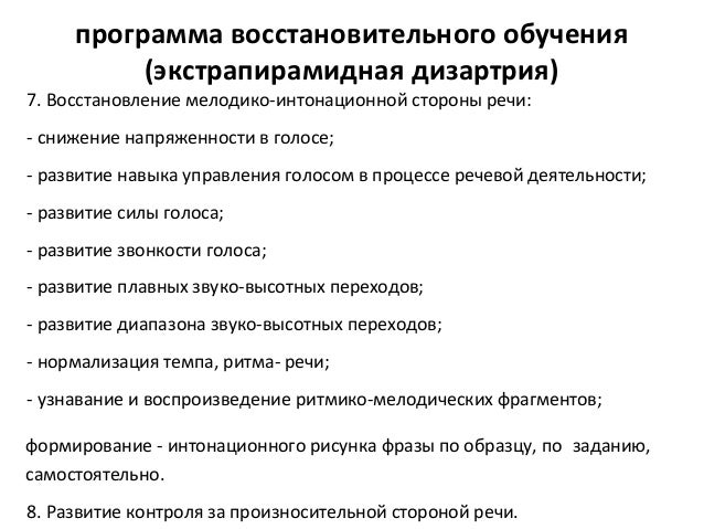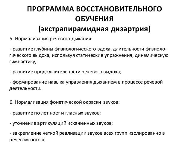 - 86. ПРОГРАММА ВОССТАНОВИТЕЛЬНОГО ОБУЧЕНИЯ (экстрапирамидная дизартрия) 5. Нормализация речевого дыхания: - развитие глубины физиологического вдоха, длительности физиоло- гического выдоха, используя статические упражнения, динамическую гимнастику; - развитие продолжительности речевого выдоха; - формирование навыка управления дыханием в процессе речевой деятельности. 6. Нормализация фонетической окраски звуков: - развитие по лет ноет и гласных звуков; - уточнение артикуляций искаженных звуков; - закрепление четкой реализации звуков всех групп изолированно в речевом потоке.