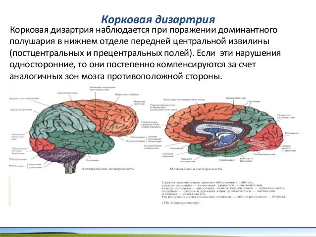 - 88. Корковая дизартрия Корковая дизартрия наблюдается при поражении доминантного полушария в нижнем отделе передней центральной извилины (постцентральных и прецентральных полей). Если эти нарушения односторонние, то они постепенно компенсируются за счет аналогичных зон мозга противоположной стороны.