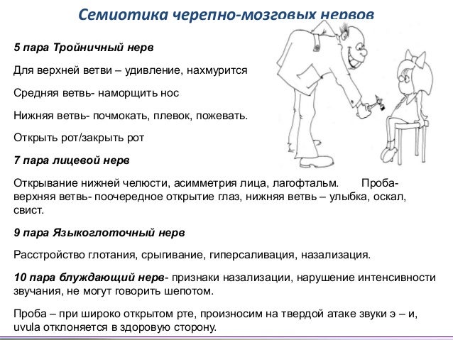 - 9. Семиотика черепно-мозговых нервов 5 пара Тройничный нерв Для верхней ветви – удивление, нахмурится Средняя ветвь- наморщить нос Нижняя ветвь- почмокать, плевок, пожевать. Открыть рот/закрыть рот 7 пара лицевой нерв Открывание нижней челюсти, асимметрия лица, лагофтальм. Проба- верхняя ветвь- поочередное открытие глаз, нижняя ветвь – улыбка, оскал, свист. 9 пара Языкоглоточный нерв Расстройство глотания, срыгивание, гиперсаливация, назализация. 10 пара блуждающий нерв- признаки назализации, нарушение интенсивности звучания, не могут говорить шепотом. Проба – при широко открытом рте, произносим на твердой атаке звуки э – и, uvula отклоняется в здоровую сторону.