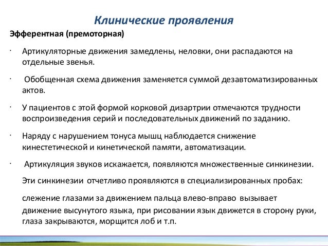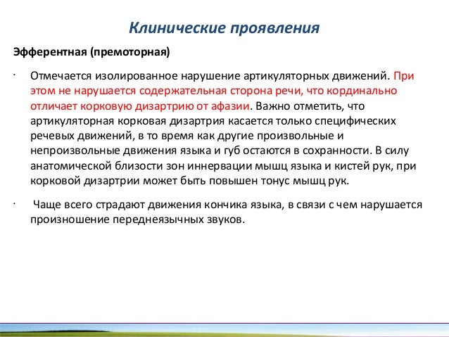 - 90. Клинические проявления Эфферентная (премоторная) • Отмечается изолированное нарушение артикуляторных движений. При этом не нарушается содержательная сторона речи, что кординально отличает корковую дизартрию от афазии. Важно отметить, что артикуляторная корковая дизартрия касается только специфических речевых движений, в то время как другие произвольные и непроизвольные движения языка и губ остаются в сохранности. В силу анатомической близости зон иннервации мышц языка и кистей рук, при корковой дизартрии может быть повышен тонус мышц рук. • Чаще всего страдают движения кончика языка, в связи с чем нарушается произношение переднеязычных звуков.