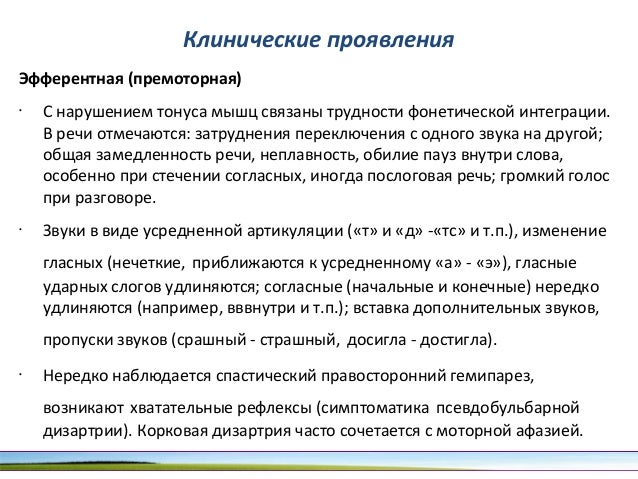 - 92. Клинические проявления Эфферентная (премоторная) • С нарушением тонуса мышц связаны трудности фонетической интеграции. В речи отмечаются: затруднения переключения с одного звука на другой; общая замедленность речи, неплавность, обилие пауз внутри слова, особенно при стечении согласных, иногда послоговая речь; громкий голос при разговоре. • Звуки в виде усредненной артикуляции («т» и «д» -«тс» и т.п.), изменение гласных (нечеткие, приближаются к усредненному «а» - «э»), гласные ударных слогов удлиняются; согласные (начальные и конечные) нередко удлиняются (например, вввнутри и т.п.); вставка дополнительных звуков, пропуски звуков (срашный - страшный, досигла - достигла). • Нередко наблюдается спастический правосторонний гемипарез, возникают хватательные рефлексы (симптоматика псевдобульбарной дизартрии). Корковая дизартрия часто сочетается с моторной афазией.