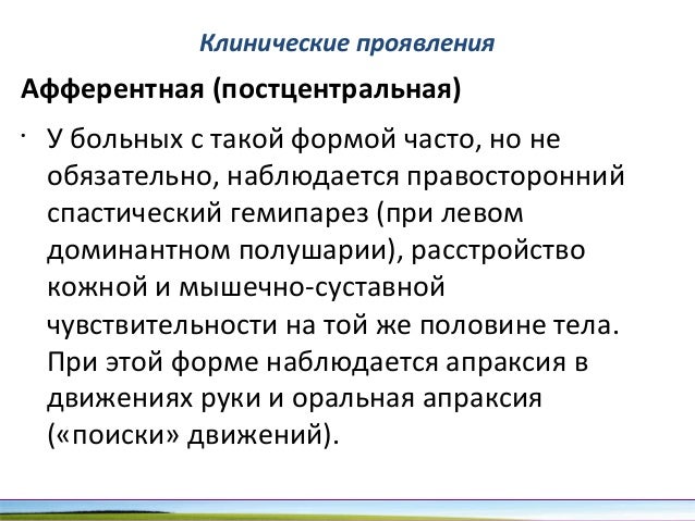 - 93. Клинические проявления Афферентная (постцентральная) • У больных с такой формой часто, но не обязательно, наблюдается правосторонний спастический гемипарез (при левом доминантном полушарии), расстройство кожной и мышечно-суставной чувствительности на той же половине тела. При этой форме наблюдается апраксия в движениях руки и оральная апраксия («поиски» движений).