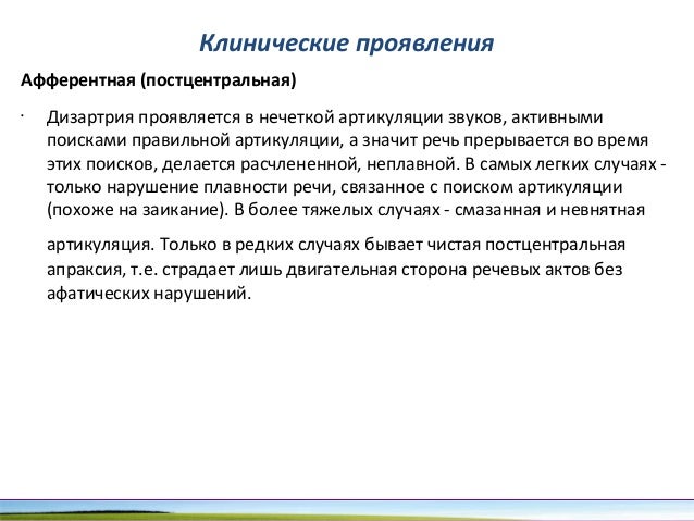 - 94. Клинические проявления Афферентная (постцентральная) • Дизартрия проявляется в нечеткой артикуляции звуков, активными поисками правильной артикуляции, а значит речь прерывается во время этих поисков, делается расчлененной, неплавной. В самых легких случаях - только нарушение плавности речи, связанное с поиском артикуляции (похоже на заикание). В более тяжелых случаях - смазанная и невнятная артикуляция. Только в редких случаях бывает чистая постцентральная апраксия, т.е. страдает лишь двигательная сторона речевых актов без афатических нарушений.