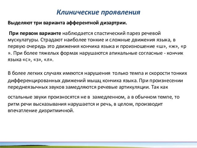 - 95. Клинические проявления Выделяют три варианта афферентной дизартрии. При первом варианте наблюдается спастический парез речевой мускулатуры. Страдают наиболее тонкие и сложные движения языка, в первую очередь это движения кончика языка и произношение «ш», «ж», «р ». При более тяжелых формах нарушаются апикальные согласные - кончик языка «с», «з», «л». В более легких случаях имеются нарушения только темпа и скорости тонких дифференцированных движений мышц кончика языка. При произнесении переднеязычных звуков замедляются речевые артикуляции. Так как остальные звуки произносятся не в замедленном, а в обычном темпе, то ритм речи высказывания нарушается и речь, в целом, производит впечатление дизритмичной.