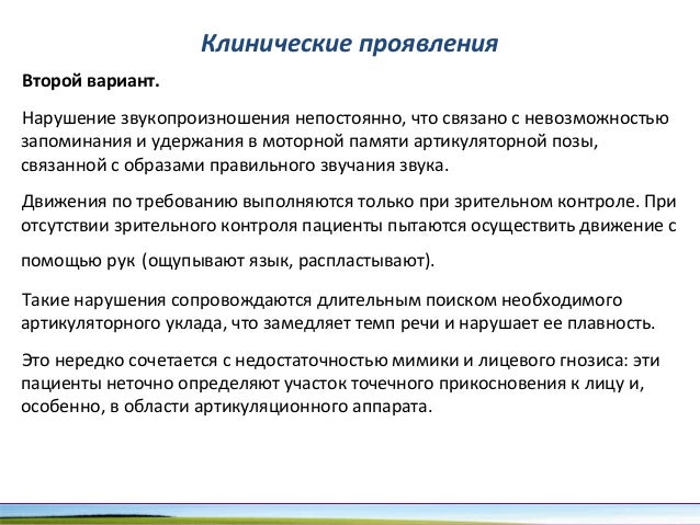 - 96. Клинические проявления Второй вариант. Нарушение звукопроизношения непостоянно, что связано с невозможностью запоминания и удержания в моторной памяти артикуляторной позы, связанной с образами правильного звучания звука. Движения по требованию выполняются только при зрительном контроле. При отсутствии зрительного контроля пациенты пытаются осуществить движение с помощью рук (ощупывают язык, распластывают). Такие нарушения сопровождаются длительным поиском необходимого артикуляторного уклада, что замедляет темп речи и нарушает ее плавность. Это нередко сочетается с недостаточностью мимики и лицевого гнозиса: эти пациенты неточно определяют участок точечного прикосновения к лицу и, особенно, в области артикуляционного аппарата.
