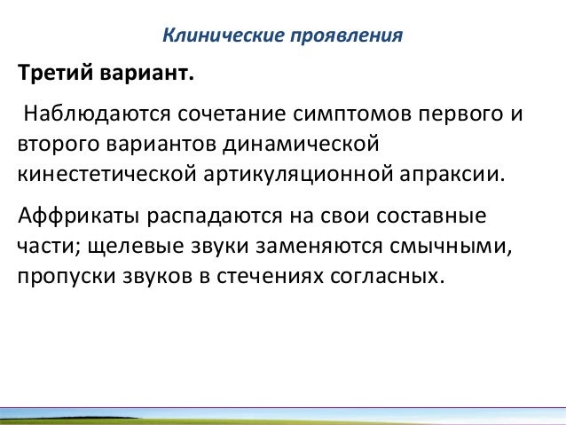 - 97. Клинические проявления Третий вариант. Наблюдаются сочетание симптомов первого и второго вариантов динамической кинестетической артикуляционной апраксии. Аффрикаты распадаются на свои составные части; щелевые звуки заменяются смычными, пропуски звуков в стечениях согласных.