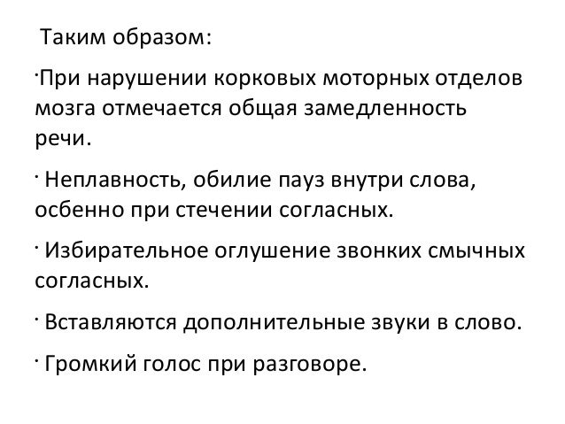 - 98. Таким образом: • При нарушении корковых моторных отделов мозга отмечается общая замедленность речи. • Неплавность, обилие пауз внутри слова, осбенно при стечении согласных. • Избирательное оглушение звонких смычных согласных. • Вставляются дополнительные звуки в слово. • Громкий голос при разговоре.