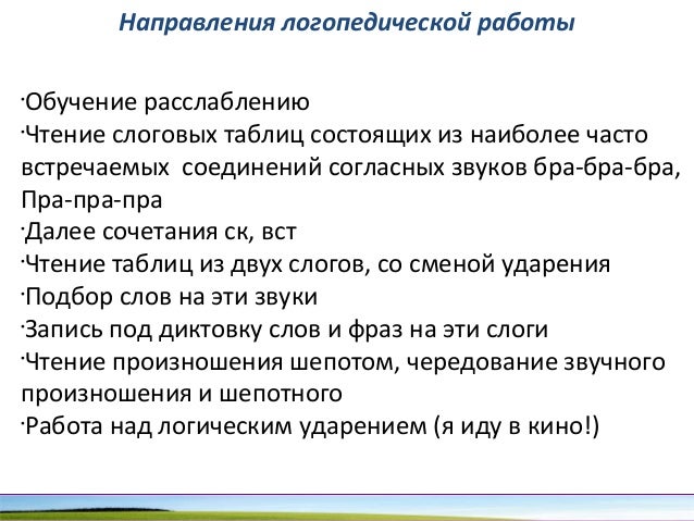 - 99. Направления логопедической работы • Обучение расслаблению • Чтение слоговых таблиц состоящих из наиболее часто встречаемых соединений согласных звуков бра-бра-бра, Пра-пра-пра • Далее сочетания ск, вст • Чтение таблиц из двух слогов, со сменой ударения • Подбор слов на эти звуки • Запись под диктовку слов и фраз на эти слоги • Чтение произношения шепотом, чередование звучного произношения и шепотного • Работа над логическим ударением (я иду в кино!)